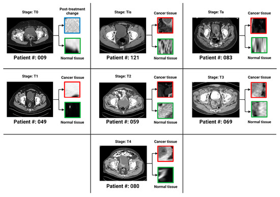 One bladder CT scan per stage (along with the corresponding regions of interest that were used in the various classification tasks) has been provided. The seven stages of urothelial carcinoma analyzed in the study are Ta, Tis, T0, T1, T2, T3 and T4 (T0 has not been shown in the figure because T0 represents a stage where the tissue of interest shows no evidence of malignancy).