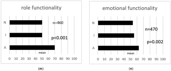 (a–n) EORTC QLQ-C30, association with quality of life. N: patients who had no interest in sex and were not sexually active; I: patients who had an interest in sex but were not sexually active; A: patients who had an interest in sex and who were sexually active.