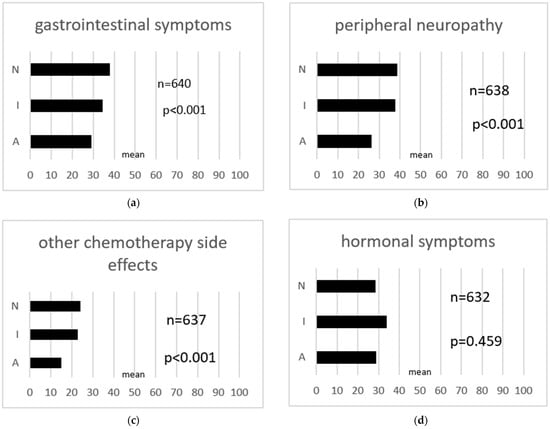 Sexual interest and activity were correlated with global quality of life, functionalities, and symptoms based on the EORTC quality of life questionnaire QLQ-C30 (Figure 1) and EORTC QLQ-OV28 (Figure 2). Data for the EORTC QLQ-OV28 were available from 644 patients. Global quality of life was higher in patients who had an interest in sex and who were sexually active and was lowest in patients who were not sexually interested and not sexually active (p < 0.001). Regarding the different functionalities of quality of life, patients in group A (sexually interested and active) showed higher levels in terms of physical functionality (p < 0.001), social functionality (p < 0.001), role functionality (p < 0.001), and emotional functionality (p = 0.002). Group A reported less nausea and vomiting (p = 0.007), less loss of appetite (p < 0.001), less diarrhea (p = 0.008), less dyspnea (p < 0.001), less pain (p < 0.001), less fatigue (p < 0.001), and less insomnia (p = 0.004). There were no differences regarding constipation and financial difficulties between the three groups. The analyses of the Ovar28 showed that patients who were interested in sex and sexually active (group A) reported lower levels of gastrointestinal symptoms (p < 0.001) and peripheral neuropathy (p < 0.001). Hormonal symptoms like hot flushes or night sweats did not differ between patient groups. Patient group A showed the lowest levels for attitude to disease and treatment compared to the other groups (p = 0.046). Patients in group I and N felt less attractive and were more dissatisfied with their body (body image: p = 0.012) (Figure 1 and Figure 2).