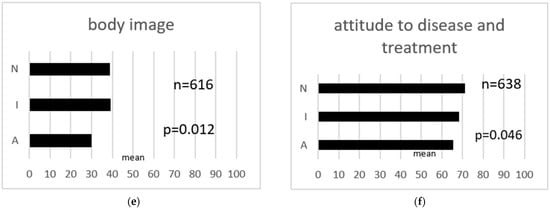 (a–f) EORTC QLQ-OV28, association with quality of life. N: patients who had no interest in sex and were not sexually active; I: patients who had an interest in sex but were not sexually active; A: patients who had an interest in sex and who were sexually active.