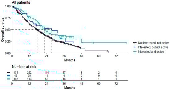 Follow-up data, including survival data, were available for 642 patients. Median overall survival was 19.4 months for the entire patient group of 642 patients. Patients who were interested in sex and were sexually active showed better survival rates compared to patients who were not interested and not sexually active (22.3 months vs. 17.4 months, p < 0.001 in pairwise comparisons). The median survival of patients who were interested in sex but not sexually active was 27.4 months. Overall survival was associated with interest in sex and sexual activity. Overall survival was significantly shorter in patients without interest in sex who were not sexually active (hazard ratio (HR) 1.5; 95% confidence interval (CI) 1.19–1.92; p = 0.001). This finding could be confirmed via multivariate cox regression analysis after adjusting for age at randomization, number of relapses, FIGO, and ECOG (HR 1.36, 95% CI 1.05–1.76, p = 0.02) (Figure 3).