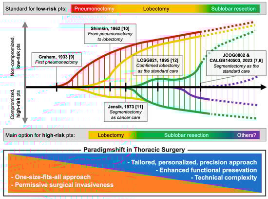 12]. The color-coded lines delineate the shifting preferences in surgical techniques, from the early practice of pneumonectomy to the advancement of sublobar resections, marking a transition to patient-tailored techniques. This historical overview highlights the move towards preserving lung function and addressing noncancer-related outcomes with consideration to the treatment in non-compromised low-risk patients (above the x-axis in the figure) and compromised high-risk lung cancer patients (below the x-axis). This treatment shift reflects a move away from a one-size-fits-all approach towards a tailored, personalized, precision approach that emphasizes functional preservation despite the increased technical complexity of such surgeries.