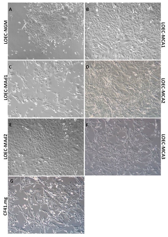 The six LOEC cell lines (LOEC-NMG, LOEC-MCA1, LOEC-MCA2, LOEC-MCA3, LOEC-MAd1, and LOEC-MAd2) were grown on a coverslip in six-well plates in advanced DMEM, HEPES (10 mM), L-glutamine (2 mM), 1% antibiotic–antimycotic, cholera toxin (10 ng/mL), 1% mammary epithelial growth supplement), 0.5% FBS, 100 units/mL penicillin G, and 100 mg/mL streptomycin at 37 °C in a humidified atmosphere of 5% CO2. Only the CF41.mg line was cultivated with DMEM, 10% fetal bovine serum, and L-glutamine (2 mM). After 2 days of cultivation, the cells were washed with PBS and fixed in 70% ethanol for 20 min at −20 °C. Cells were permeabilized with PBS containing 0.1% Triton X-100 for 20 min. Then, the coverslips were subjected to antigen exposure for 30 min in boiling with ethylenediaminetetraacetic acid (EDTA) at pH 9.0.