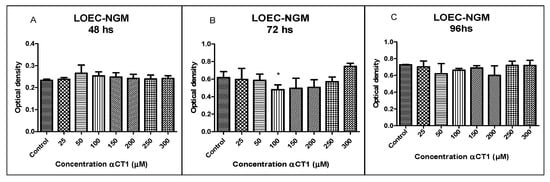 Treatment with different αCT1 peptide concentrations (25, 50, 100, 150, 200, 250, and 300 µM) in the LOEC-NMG strain did not show an inhibitory activity in any of the concentrations at 48 and 96 h (Figure 2). The 72 h treatment showed inhibitory activity, with a statistical difference of * p < 0.05 at a concentration of 100 µM.
