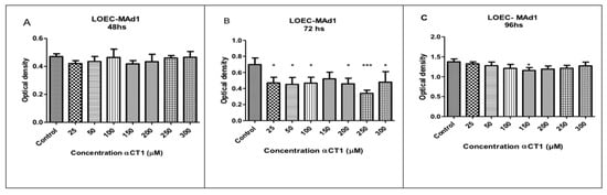 Viability of LOEC-MAd1 canine mammary adenoma lineage at 48, 72, and 96 h after the treatment with αCT1 peptide. Significant decreases in viability were observed at 72 h in LOEC-MAd1 (A). LOEC- MAd1 treated with αCT1 peptide for 48 h showed no statistical differences when compared to control; (B). LOEC- MAd1 treated with αCT1 peptide for 72 h showed statistically significant decreases in viability when compared to control at all concentrations (from 25 μM to 300 μM); (C). LOEC- MAd1 treated with αCT1 peptide for 96 h showed no statistical differences when compared to control. (one-way ANOVA statistical analysis (* p < 0.05, *** p < 0.0001).