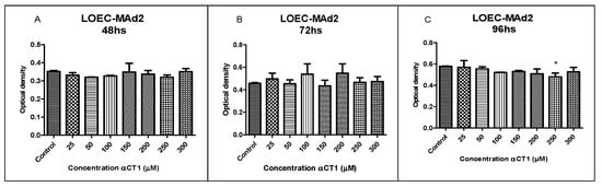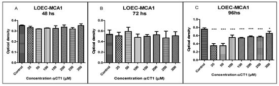 The treatment with different αCT1 peptide concentrations (25, 50, 100, 150, 200, 250, and 300 µM) in the LOEC-MAd1 strain did not show an inhibitory activity in any of the concentrations at the time of 48 h. However, the 72 h treatment showed significant inhibitory activity of * p < 0.05 at concentrations of 25, 50, 100, 200, and 300 µM and *** p < 0.0001 at a concentration of 250 µM (Figure 3). The LOEC-MAd1 strain showed a time sensitivity of 96 h with a statistical difference of * p < 0.05 at a concentration of 150 µM.