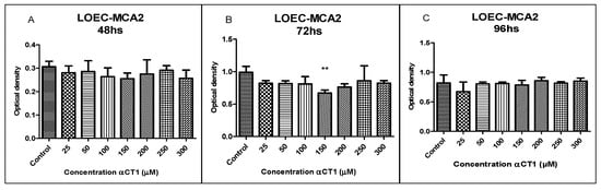The treatment with different αCT1 peptide concentrations (25, 50, 100, 150, 200, 250, and 300 µM) in the LOEC-MCA2 cell line showed no statistically different inhibitory activity in any of the concentrations at 48 and 96 h, demonstrating increased resistance to treatment with the peptide (Figure 6). The LOEC-MCA2 strain showed sensitivity after 72 h of treatment at an αCT1 peptide concentration of 150 µM with a statistical difference of ** p < 0.01.