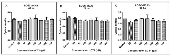 The treatment with different αCT1 peptide concentrations (25, 50, 100, 150, 200, 250, and 300 µM) in the LOEC-MCA3 strain did not show any inhibitory activity, with no statistical difference at any of the concentrations at 48, 72, and 96 h (Figure 7).