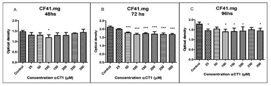 The results of the treatment with αCT1 peptide revealed an inhibitory activity with a statistical difference of * p < 0.05 at a concentration of 100 µM at 48 h in the CF41.mg strain. After 72 h of treatment with the same strain, inhibitory activity was observed with a statistical difference of *** p < 0.001 at αCT1 concentrations of 50, 100, 150, 200, 250, and 300 µM (Figure 8B). At 96 h of treatment, CF41.mg had a slightly lower sensitivity than at 72 h, with a statistical difference of * p < 0.05 at concentrations of 25, 100, 150, 200, and 300 µM (Figure 8).