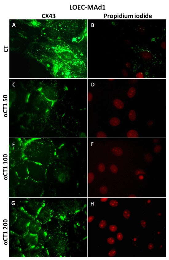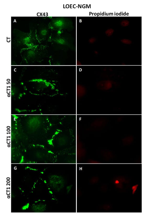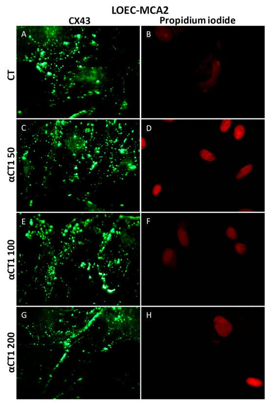 The Cx43 expression profiles in canine mammary strains exposed to αCT1 treatment were evaluated and compared using an immunofluorescence assay. Immunofluorescence results showed that the LOEC-NGM cells presented Cx43 located in the membranes, and the treatment with αCT1 peptide increased the Cx43 plaques in cell membranes (Figure 9).