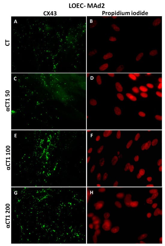 Figure 10 shows that LOEC-MAd1 control cells presented the expression of Cx43 in the cytoplasm but also in the cell membranes; the αCT1 peptide increased the Cx43 plaques in cell membranes. LOEC MAd2 also presented Cx43 localized in both cytoplasm and membranes and the treatment with the αCT1 peptide increased the Cx43 plaques in cell membranes (Figure 11).