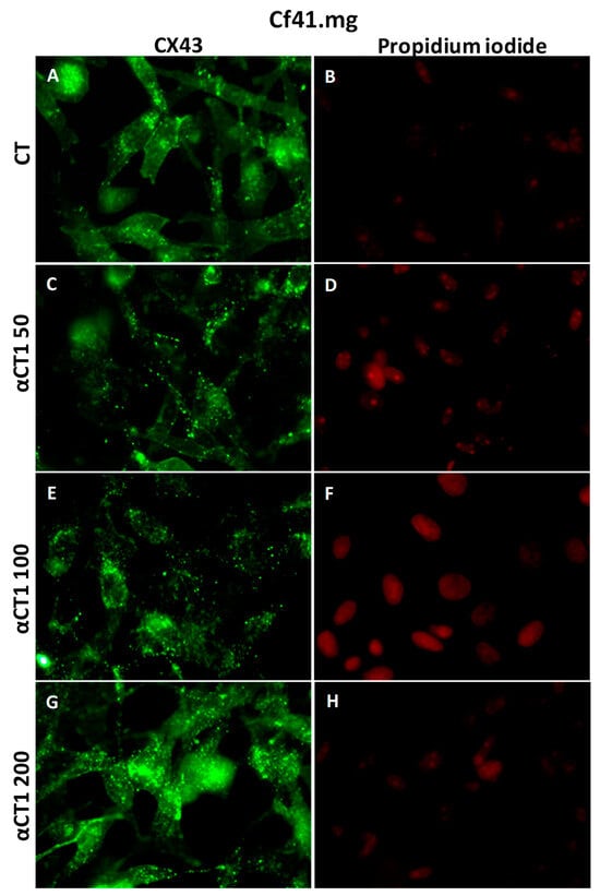 Immunofluorescence photomicrograph for CX43 in the canine mammary lineage CF41. More Cx43 spots in cytoplasm and membranes are seen with the highest concentration of αCT1 (G); (A,C,E,G) show immunofluorescence positivity of Cx43 in cell membranes; (B,D,F,H) show cell nuclei stained with propidium iodide. 40× objective.