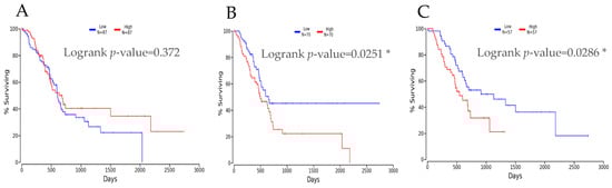 - Anaya, J. OncoLnc: Linking TCGA Survival Data to mRNAs, miRNAs, and lncRNAs. PeerJ Comput. Sci. 2016, 2, e67. [Google Scholar] [CrossRef]