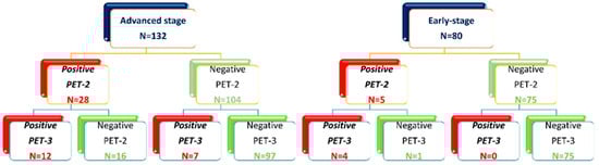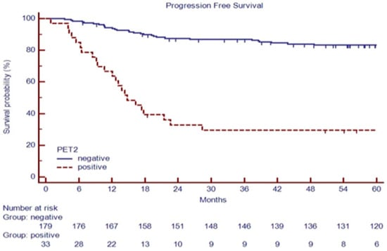 A positive PET2 status, as a surrogate of the tumor’s low chemo-sensitivity, reflects the persistence of inflammatory cells with high glycolytic activity [5,6], and it is considered the most valuable tool to set up a risk-adapted strategy [7,8].