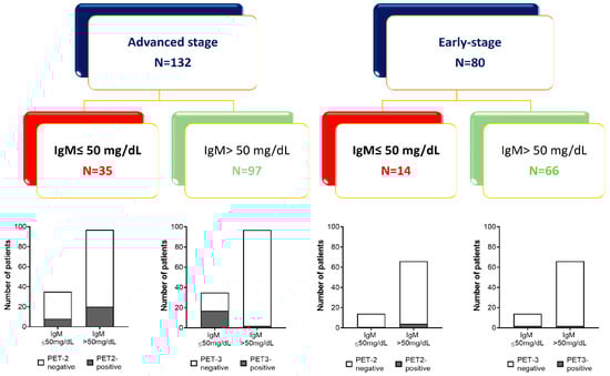 The primary endpoint of the study was to establish if baseline immunoglobulins could have any impact on the progression-free survival (PFS) of newly diagnosed HL patients. The secondary endpoint included the evaluation of baseline immunoglobulins to predict overall survival (OS) or PET-2 status in the whole cohort or only in the cohort of advanced-stage patients.