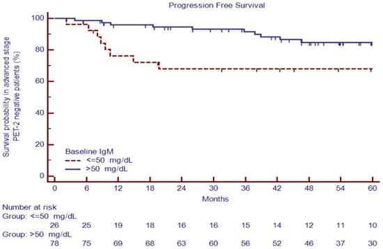 Advanced-stage patients with positive PET-2 had an inferior outcome, with a 5-year PFS of 25.2% versus 80.5% for negative PET-2 patients (p < 0.0001). After two cycles of treatment, patients with negative PET-2 carrying IgM ≤ 50 mg/dL had poor outcomes, with a PFS at 60 months of 68.0% versus 84.7% for cases with IgM > 50 mg/dL, p = 0.0068 (Figure 6), the only predictor of the outcome in the univariate analysis (Table 4).