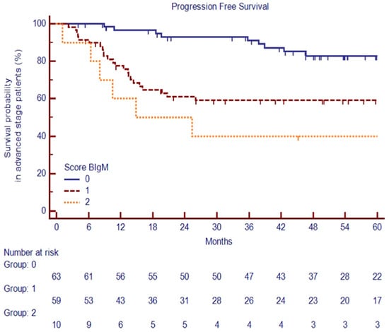 The PFSs at 60 months were significantly different among the three risk groups, at 83.5%, 59.5%, and 40.0%, respectively, p < 0.0001 (Figure 7).