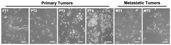 Phase contrast images of primary cultures derived from ccRCC primary tumors (PT1-4) and metastatic tumors (MT1 and 2) showing the characteristic clear cytoplasm of ccRCC cells (arrows). Bars = 100 μm.