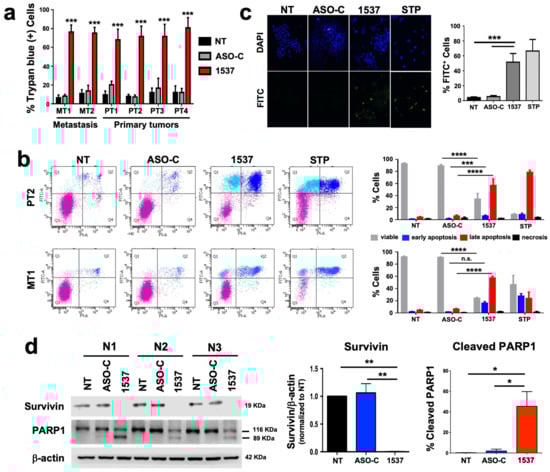 For further studies, we selected one primary tumor culture (PT2) and one metastatic tumor culture (MT1). The transfection of both cultures with ASO-1537 induced a high degree of apoptosis as determined through Annexin V binding assay, compared to basal levels in controls. These levels were comparable to those obtained in cells treated with the pan-kinase inhibitor staurosporin (STP) (Figure 2b). We further demonstrated apoptotic death in the MT1 culture by DNA fragmentation (TUNEL) assay (Figure 2c), reduction in survivin levels and PARP1 cleavage (Figure 2d). In addition, we compared the results on tumor cells with the first-line ccRCC treatment drug Sunitinib [18]. First, we established the IC50 of this drug for both cultures, PT2 and MT1, in order to define a range of concentrations to be used in cultured cells (Figure S2a). Cells were then treated at concentrations close to or over the IC50 of each cell and compared to ASO-C or ASO-1537-transfected or non-treated cells, for 48 h. Figure S2b shows that Sunitinib, at two different concentrations, displayed a lower efficiency in inducing cell death of PT2 and MT1.
