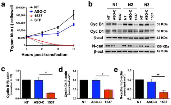 We reported that tumor cell lines from a wide array of human tissues undergo a proliferative block upon knockdown of ASncmtRNAs [12,14,15,16,17]. Therefore, we studied whether the patient-derived primary culture of metastatic ccRCC (MT1) would follow the same tendency. As depicted in Figure 3a, MT1 cells transfected with ASO-1537 suffered a sudden proliferation blockage, similar to STP-treated cells, while control cells continued to proliferate. This cell cycle arrest is evidenced at the molecular level through a loss in cyclins B1 and D1 (Figure 3b–d). In addition, this metastasis-derived primary culture also displays a strong reduction in N-cadherin, representing a loss in EMT potential, a key event in metastasis (Figure 3b,e). Metastatic potential is also directly related to the presence of cancer stem cells (CSCs) in the tumor population [19]. We found that ASO-1537 precluded the formation of spheroids, a hallmark of stemness in tumor cells (Figure S6).