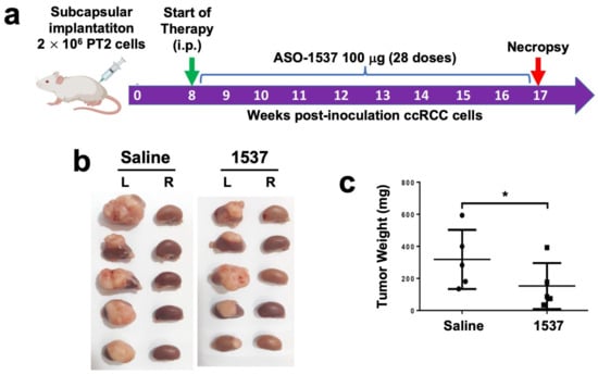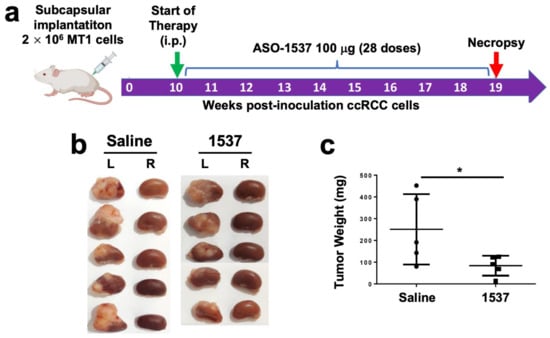 ASO-1537 reduces growth of MT1 subcapsular tumors. (a) Scheme depicting the protocol used for the orthotopic xenograft model. Injections were performed every 48 h and saline was used as control; (b) images showing the left (inoculated) and right (non-inoculated) kidneys of the five mice in each experimental group at 19 weeks post-cell inoculation; (c) tumor weight of the five mice in each group; * p < 0.05. Mouse and syringe image in (a) was created using Biorender (biorender.com) (accessed on 30 August 2023).