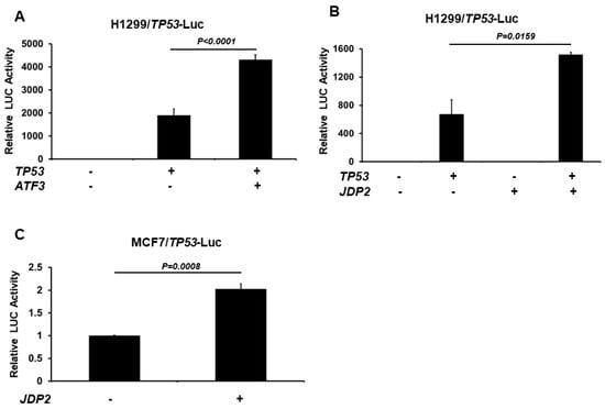 ATF3 and JDP2 increase p53 transactivation. Luciferase assays were performed to analyze p53 transactivation in H1299 cells (A,B) transfected either with or without WT p53 expression plasmids, in the absence or presence of ATF3 expression plasmid (A) or JDP2 expression plasmid (B). The luciferase assays were performed to analyze p53 transactivation in MCF7 cells (C) transfected either with or without JDP2 expression plasmids. After 48 h post transfection, luciferase activities were measured using the Dual Luciferase Reporter System and normalized to the control Renilla activity. The relative luciferase (LUC) activity was calculated and plotted. A p < 0.05 indicates statistical significance between groups.