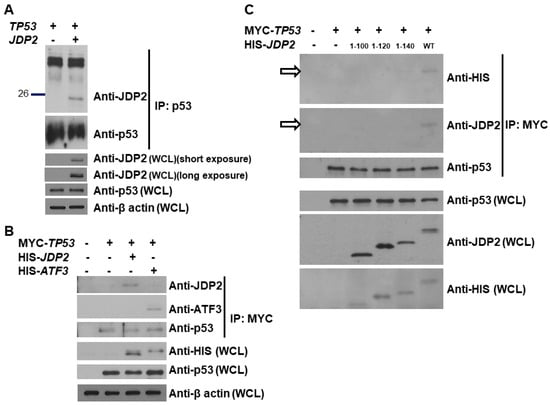 Over the past decade, many studies have demonstrated the functions of JDP2, such as: (1) serving as a histone chaperone in cellular senescence and aging [], (2) functioning as a cellular survival protein critical for normal cellular activities [], and (3) inhibiting UV-mediated apoptosis via the down-regulation of p53 []. More recently, JDP2 has played roles in atrial fibrillation, cardiac remodeling, and heart failure. In addition, more studies have demonstrated that deficiencies in both JDP2 and ATF3 contribute to maladaptive cardiac remodeling while preserving the cardiac function []. Interestingly, in mouse models, it has been shown that p53 negatively regulates JDP2 [], and JDP2, in turn, down-regulates TrP53 transcription to promote leukemogenesis, suggesting a regulatory loop between p53 and JDP2. Therefore, the present study provides the interaction between JDP2 and p53, suggesting that future studies are needed to dissect the underlying mechanisms of JDP2-p53 regulatory loop in details.