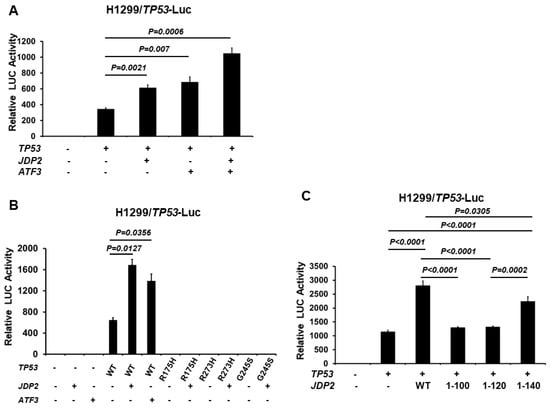 Over the last two decades, the relationship between ATF3 and p53 has been expanded, such as (1) ATF3 plays a role in regulating the stability of p53 [], (2) p53 transcriptionally upregulates the ATF3 gene promoter [], (3) SUMOylation of ATF3 modifies its transcriptional activity in the regulation of TP53 gene [], (4) ATF3 activates p53 by blocking its ubiquitination [], and (5) ATF3 suppresses the oncogenic function of mutant p53 proteins []. Since JDP2 shares significant homology in the C-terminal domain with ATF3, it is likely that JDP2 exerts a similar impact on p53. Our current study provides evidence that JDP2 is able to bind to p53 through its C-terminal domain. Moreover, our findings suggest an additive effect of ATF3 and JDP2 on p53 transactivation. However, JDP2 is unable to transactivate the conformational (R175H and G245S) and contact (R273H) p53 mutants, suggesting that JDP2 cannot restore mutant p53’s trans-repression. Therefore, future studies are needed to dissect whether JDP2 can directly bind to human p53 mutants (more than thousands) found in major cancers.