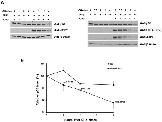 Since JDP2 binds to p53 and increases p53 transactivation (Figure 1 and Figure 2), and because ATF3 binding to p53 increases p53 stability [], we investigated whether JDP2 affects p53 stability. To assess this question, cycloheximide (CHX) experiments were performed by introducing CHX to H1299 cells expressing either p53 alone or both p53 and JDP2 at various time point. As shown in Figure 4, the levels of p53 in the presence of JDP2 were slightly increased compared to those without p53 (approximately a 25% difference at 4-h time point). This result indicates that JDP2 can slightly stabilize p53 in H1299 cells.