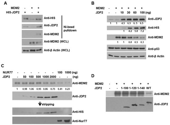 Since JDP2 binds to p53, increases p53 transactivation (Figure 1, Figure 2 and Figure 3), and slightly stabilizes p53 (Figure 4), we then investigated whether JDP2 is able to bind to MDM2 and affects the levels of MDM2, the main negative regulator of p53. As shown in Figure 5A, JDP2 is able to bind to MDM2 in Ni-bead pulldown assay. To assess whether JDP2 affects the levels of MDM2, we transfected MDM2 expression plasmid and various doses of JDP2 expression plasmids to MCF7. As shown in Figure 5B, JDP2 dose-dependently decreases the levels of MDM2. In order to confirm JDP2’s effect on MDM2, we examined whether this effect can be observed for endogenous MDM2 in a different cellular context. We also tested Nur77 in the same experiments because Nur77 has been shown to repress the expression of MDM2 []. As shown in Figure 5C, JDP2 dose-dependently decreases the levels of endogenous MDM2 in H1299 cells. As expected, Nur77 also decreases MDM2 levels. Since JDP2 decreases MDM2 levels, we examined whether the C-terminal domain of JDP2 is required for MDM2 repression. As shown in Figure 5D, the C-terminal domain (amino acids 140–168) is indeed essential for JDP2-mediated MDM2 repression. These results suggest that JDP2 has the ability to bind to MDM2 and decrease the levels of MDM2.
