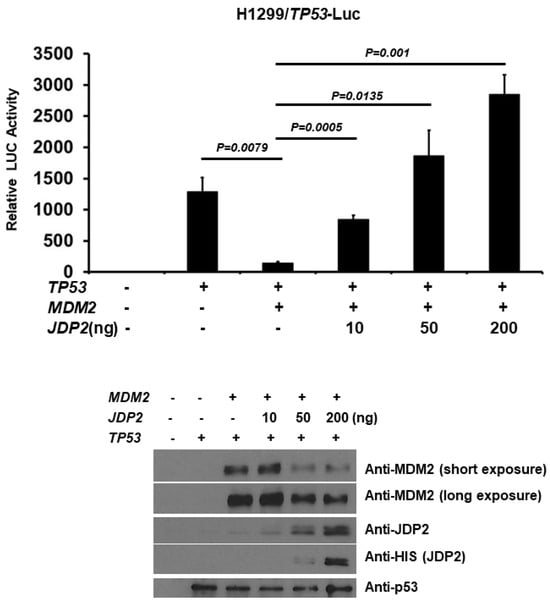 While MDM2 decreases p53 transactivation, JDP2 dose-dependently abolishes MDM2-mediated p53 repression. H1299 cells were co-transfected with the p53 (14X)RE-Luc reporter plasmid and the pRL-TK Renilla control plasmid, along with or without p53, MDM2, and JDP2 (various doses) expression plasmids using Fugene HD transfection reagent. After 48 h post transfection, luciferase activities were measured using the Dual Luciferase Reporter System and normalized to the control Renilla activity. The relative luciferase (LUC) activity was calculated and plotted. A p < 0.05 indicates statistical significance between groups. The original western blot figures can be found in Figure S1.