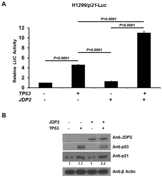Since p21 serves as the downstream gene of p53, we examined how JDP2 influences p21 promoter activity in the presence of p53. The binding site of p53 on p21 promoter is located from −2253 to −2232 (GAACATGTCCCAACATGTTG). H1299 cells were co-transfected with a p21 promoter(−2347 to +354)-Luc-pGL3 reporter plasmid and a pRL-TK Renilla control plasmid, and with or without p53 and JDP2 expression plasmids. As shown in Figure 7A, JDP2 demonstrated a significant increase in p21 promoter activity in the presence of p53, which suggests increased p53 transactivation in the presence of JDP2. To validate the effect of JDP2 in p21 protein levels in the presence of p53, we transfected cells with JDP2 expression plasmid, or p53 expression plasmid, or combination of JDP2 and p53 expression plasmids. As shown in Figure 7B, JDP2 demonstrated an increase in p21 protein level in the presence of p53. Overall, these findings suggest that JDP2 is a novel regulator in up-regulating p53 transactivation in a p53’s downstream gene activity.