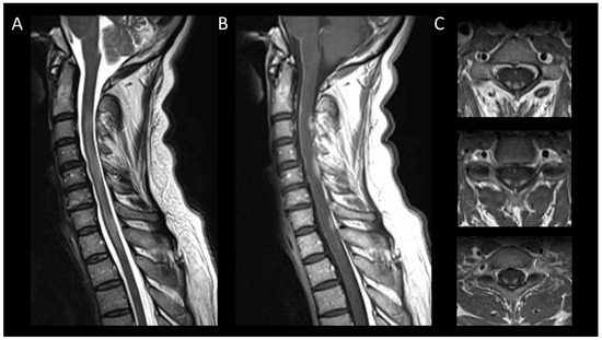 Degenerative compressive myelopathy. (A) Sagittal T2-weighted MRI of the cervical spine. (B) Sagittal T1-weighted MRI post-injection of the cervical spine. (C) Sagittal T2-weighted MRI of the cervical spine in axial sections. This figure illustrates a short myelitis centered on a posterior disc herniation at the level of C5–C6 (A) with linear “pancake-like” enhancement at the site of the maximum canal stenosis (B). Axial images (C) show lesions predominantly affecting gray matter resulting in an H-shaped appearance.