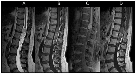 Hematomyelia may require investigating secondary factors in non-traumatic cases. The leading cause of hematomyelia is spinal trauma, followed by vascular and cavernous malformations in non-traumatic etiologies [86]. The signal intensity of hematomyelia (Figure 12) varies with its chronologic progression [87]. If no underlying lesion is identified initially, a follow-up MRI after 3 months is recommended to ensure that no lesion is obscured by the hematoma. Hemorrhagic cavernomas usually shrink at follow-up, whereas tumors do not.