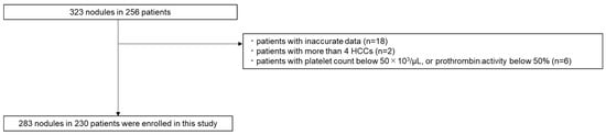 This study included 283 nodules in 230 patients with HCC who received RFA therapies at our institution between January 2018 and 2022 (Figure 1). The inclusion criteria were as follows: patients (1) >18 years old; (2) with performance status of 0 or 1; (3) who had surgically unresectable HCC lesions or who voluntarily chose nonsurgical treatment; (4) with three or fewer lesions and ≤5 cm in diameter; (5) with total serum bilirubin concentration of <3 mg/dL; and (6) without extrahepatic metastasis or vascular tumor invasion. Patients with (1) a platelet count below 50 × 109/L, (2) prothrombin activity below 50%, (3) refractory ascites, and (4) nodules suspected of poorly differentiated HCC on pretreatment imaging and patients (5) receiving a combination of local and other therapies were excluded from this study [19,20,21]. In cases with multiple nodules, cases with two nodes in close proximity to each other, such that the predicted area of ablation at the time of ablation of target nodule included the other nodule, were excluded.