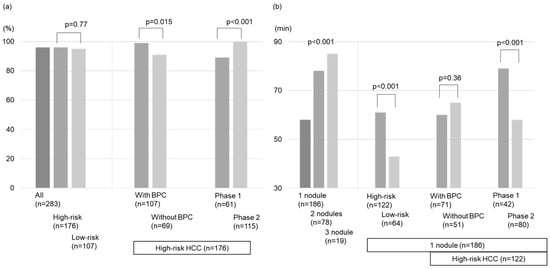 The treatment duration according to the nodule number is reported in Figure 2b. The high-risk location group in patients with 1 target lesion demonstrated longer treatment duration than the low-risk location group (61 min vs. 43 min, p < 0.001). However, no differences were found in the procedure time between the groups with and without BPC in the high-risk location group (p = 0.36; Figure 3b).