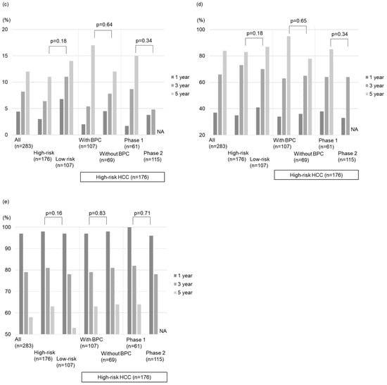 The intrahepatic distant recurrence rates for all nodules during the follow-up period were 37%, 66%, and 84% at 1, 3, and 5 years, respectively (Figure 4d). The difference in intrahepatic distant recurrence rates between the high- and low-risk location groups was insignificant (p = 0.18; Figure 4e). Moreover, there was no significant difference in intrahepatic distant recurrence rates between the groups without and with BPC in the high-risk location group (p = 0.65; Figure 3d and Figure 4f).