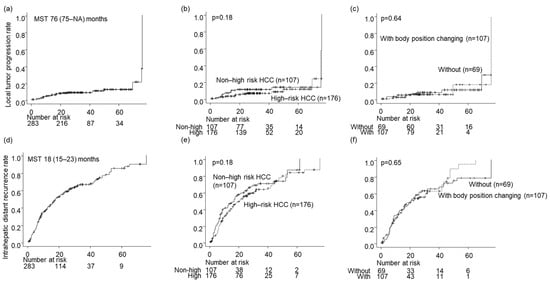 The local tumor progression rates for all nodules during the follow-up period were 4.4%, 8.2%, and 12% at 1, 3, and 5 years, respectively (Figure 4a). The local tumor progression rate showed no significant difference between the high- and low-risk location groups (p = 0.18; Figure 4b). Similarly, there was no significant difference in the local tumor progression rate between the groups without and with BPC in the high-risk location group (p = 0.64; Figure 3c and Figure 4c).