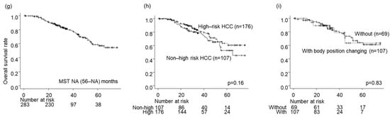 The survival rates for all nodules were 97%, 79%, and 58% after 1, 3, and 5 years, respectively (Figure 4g). No significant difference in OS was detected between the high- and low-risk location groups (p = 0.16; Figure 4h) or between the groups without and with BPC in the high-risk location group (p = 0.83; Figure 3e and Figure 4i).
