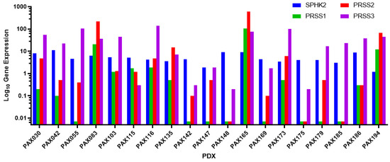 RNA sequencing data from a panel of 19 CCA PDXs established at the Mayo Clinic was analyzed to identify the most suitable PDX that expressed all the target genes at high levels [30]. The target proteins were sphingosine kinase 2, trypsin 1, trypsin 2, and trypsin 3. The respective genes for these proteins were SPHK2, PRSS1, PRSS2, and PRSS3. PAX165 had the highest expression of these proteins when compared to the other xenografts, making it the best for the study (Figure 1). Of note, sphingosine kinase 2 (SPHK2) and trypsin 3 (PRSS3), which are the main targets of opaganib and upamostat, respectively, were expressed at high levels.
