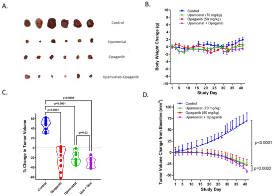(A). Representative tumor nodules at the study endpoint are shown. (B). Body weights of the mice in the different groups were monitored, and no significant changes were seen within or between the groups. (C). At the study endpoint, tumor volumes of the upamostat, opaganib, and upamostat plus opaganib treated groups were significantly decreased compared to the control group. p < 0.0001 by t-test. The suppressive effect of upamostat plus opaganib on tumor growth was greater than that of upamostat alone, p < 0.02 by t-test. (D). Tumor volume changes from baseline were monitored. Compared to the control group, upamostat and opaganib each significantly reduced tumor growth in mice (p < 0.0001). When administered together, upamostat plus opaganib suppressed tumor growth to a greater degree than upamostat alone (p = 0.0002).