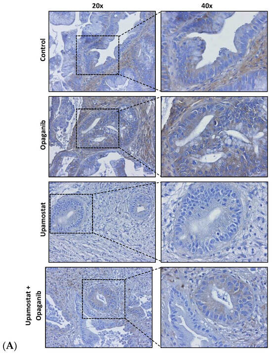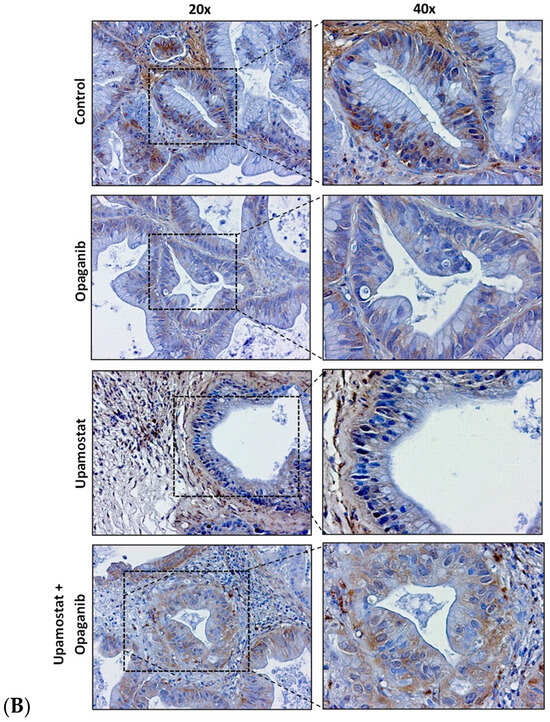 Immunohistochemical staining was performed to evaluate the expression of trypsin 1/3 and SPHK2 in CCA tissues. The staining confirmed the specificity of opaganib and upamostat for their primary targets, sphingosine kinase, and serine protease, respectively. The upamostat treatment group showed lower numbers of trypsin 1/3 (PRSS1/3) positive cells (Figure 3A), whereas significantly fewer SPHK2-expressing cells were observed in the opaganib treatment group (Figure 3B).