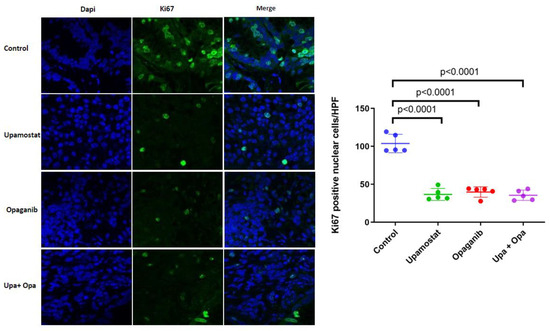 Upamostat, opaganib, and upamostat plus opaganib treatment groups showed significantly less Ki-67 staining, indicating reduced proliferation after treatment, p < 0.0001.