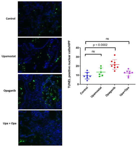 To measure the effect of upamostat and opaganib on cell apoptosis, we conducted a TUNEL assay. We found that opaganib induced a significantly higher number of TUNEL-positive cells as compared to the control group, with a p < 0.0002 (Figure 5).