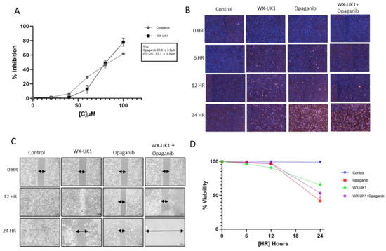 A migration assay was used to determine CCA cell proliferation after periods of 0, 12, and 24 h. HuCCT1 cells showed decreased migration when treated with a combination of WX-UK1 and opaganib (Figure 6C).