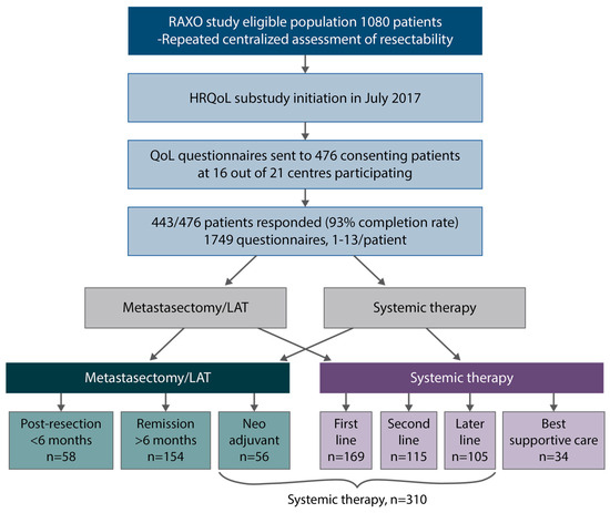 Study design, patient flow, health-related quality of life (HRQoL) questionnaires, post-resection (within 6 months after metastasectomy and/or local ablative therapy (LAT) including adjuvant-like treatment), remission (more than 6 months after metastasectomy and/or LAT), systemic therapy (mean of neoadjuvant/conversion, first-, second- and later-line), best supportive care (after ending active cancer treatment).