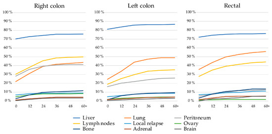 Patients with left colon tumors more often had liver metastases, both at baseline and during trajectory, than patients with right colon or rectal primaries (Figure 2). Rectal PTL was associated with a higher prevalence of lung metastases, almost doubling during trajectory, compared with patients with right colon and left colon primaries. Right colon PTL was associated with a higher prevalence of peritoneal, distant lymph node, and ovarian metastases compared to patients with left-sided colon and rectal PTLs. Liver metastases were mostly already present at baseline whereas lung, distant lymph node, and peritoneal metastases became more common over time, as did rarer metastatic sites such as bone, adrenal, or brain.