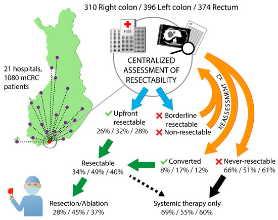 - Osterlund, P.; Salminen, T.; Soveri, L.M.; Kallio, R.; Kellokumpu, I.; Lamminmäki, A.; Halonen, P.; Ristamäki, R.; Lantto, E.; Uutela, A.; et al. Repeated Centralized Multidisciplinary Team Assessment of Resectability, Clinical Behavior, and Outcomes in 1086 Finnish Metastatic Colorectal Cancer Patients (RAXO): A Nationwide Prospective Intervention Study. Lancet Reg. Health Eur. 2021, 3, 100049. [Google Scholar] [CrossRef] [PubMed]