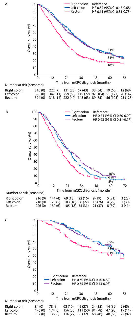 The primary tumor location (PTL) affects the phenotype, treatment alternatives, and prognosis of metastatic colorectal cancer (mCRC) [1]. The negative prognostic and predictive value of PTL for epidermal growth factor receptor (EGFR)-inhibitor treatment has led to renewed interest in the PTL [2,3]. In a large population-based SEER and national program of cancer registries material from the US, in patients with stage I–IV cancers, right colon primaries were present in 39%, left colon cancers in 24%, and rectal cancers in 30% [4].