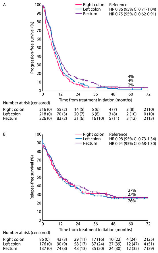RFS from first metastasectomy and/or LAT was similar for all PTLs (median RFS 11.2 vs. 12.6 vs. 13.4 months) and 5-year RFS rates (27% vs. 27% vs. 26%) for right colon, left colon, and rectal PTLs, respectively (Figure 5B).